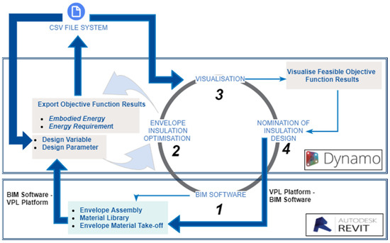 More recently, common BIM software such as Revit [8] has incorporated energy simulation and Lifecycle Analysis (LCA) as its integrated plugins. An optimisation package is also available in Revit via its Visual Programming Language (VPL) platform, Dynamo [41]. However, at the early design stage, as suggested by Shadram et al. [42], LCA is more often carried out at a highly detailed level considering the scope of the analysis and its poor interoperability with other BIM-driven design process. As for the insulation design problem, Shadram and Mukkavaara [43] developed an optimisation framework utilising BIM for placing insulations focusing on the embodied energy and the operational energy, which is obtained from the simulation results, featuring modelling software Revit and Grasshopper [44], a VPL platform of Rhino [45]. Even so, this framework is still highly relying upon an external database as the material inventory and the core of the framework for simulation and optimisation is carried out by the non-BIM software [46], Grasshopper, whereas the intrinsic characteristic of BIM as a data platform to store model and project information is underappreciated.