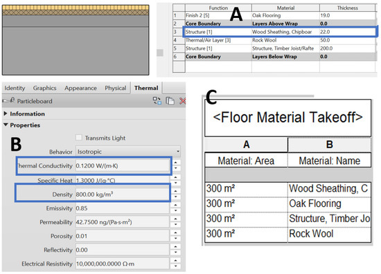 Illustrative Example for a Wood Finish Timber Floor. (A) Layers of the floor; (B) properties of materials used; (C) quantity take-off.