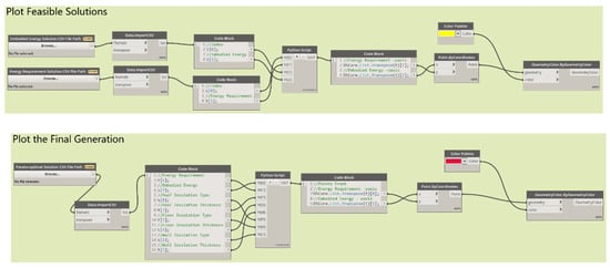 The optimal solutions produced by NSGA-II can be visualised in the form of a Pareto front when no further improvements can be made for any variable without harming other variables [69]. By visualising the Pareto-optimal design solutions, designers are able to select among a series of equally good design options more effectively [70]. The visualisation component in the proposed framework aims to provide visual presentation of the distribution of all feasible objective function values documented during the optimisation, such that whether the process has achieved its pareto optimality is made obvious to decision makers. Feasible designs are those that do not violate the design constraint. Figure 5 demonstrates the Dynamo setup for visualising datapoints. All feasible results for the objective function Embodied Energy will be plotted on the X-axis and the Energy Requirement result is visualised on the Y-axis.