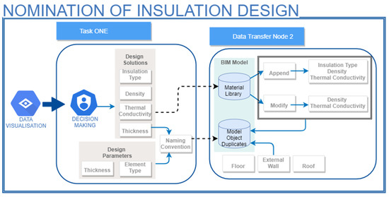 The aim of the fourth Module of the framework is to update the insulation design of the building envelope based on the decision made with reference to the visualised datapoints from the optimisation process and the Pareto-optimal solutions. Meanwhile, the material library will be maintained through a process that maps the optimal insulation materials. This is achieved mainly via three main steps; (i) selection of the optimal insulation design from the Pareto-optimal list, (ii) mapping the corresponding thermal properties into the material library, and (iii) instantiation of the solution in the BIM model. Figure 6 depicts the proposed workflow.