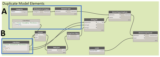 Dynamo Workflow for Duplicating and Renaming Model Element. (A) Floor assembly thickness; (B) floor insulation thickness determined by the designer.