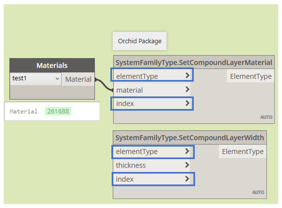 Finally, the optimal insulation material and thickness will be assigned to the renamed duplicates using two nodes from the Dynamo package Orchid [72]. Figure 8 gives an example of how a new type insulation material named ‘test1’ is populated in a drop-down list after mapping it to the material library via the Revit API. Accordingly, the thickness input should correspond to the optimal solution for the material ‘test1’. In addition, the element type and index can be fed by scripts shown in the previous graphs, as commands in Figure 7A have extracted the element type for each envelope component, and the index, representing where the insulation layer is inserted, has been specified in Figure 2A.