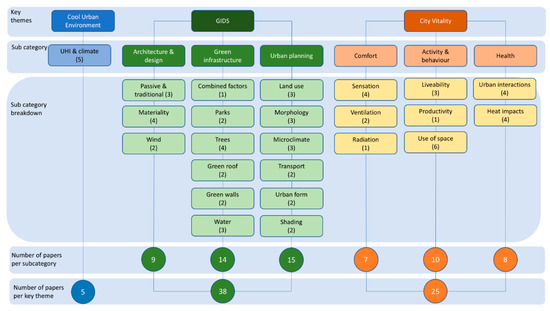 The final SLR includes 68 articles across 3 key themes and 7 sub-categories, as shown in Figure 2. The themes are city vitality, cool urban environments, and green infrastructure and design. This includes the effects of heat on human health, thermal comfort, activity, use of public space, productivity and economies; the distribution of heat impacts across global urban populations and the solution space for heat mitigation; and the mechanisms by which GIDS reduce urban heat, as well as the effectiveness of these strategies in cooling urban environments.