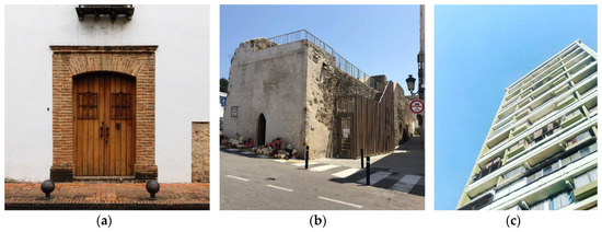 The human dimension was categorized according to the human absence or presence in the picture. Research mentioned previously recorded the action or posture of the person in the images, the surface they occupied on the canvas or the number of people. In this case, the variable is conceived as a graphic resource that provides dimension to architecture, shedding light on whether users convey a vision of heritage close to or far from people (Figure 2 and Figure 3 provide some architectural heritage pictures including and avoiding the human dimension). The nomenclature chosen to refer to the presence of people is controversial, since there are elements with more or less standard measures that provide a human dimension without the presence of people, such as windows or doors. However, heritage architecture may have been conceived according to non-anthropocentric proportions (i.e., Figure 1b). In addition, the human figure provides other connotations beyond the measurements, as mentioned above.