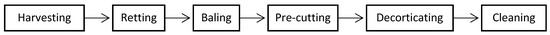 Hemp (Cannabis sativa L.) was grown at the experimental plot of Agriculture Science Center of Latgale (ASCL, 56°33′03.5″ N 26°55′17.8″ E) in 2017. The Polish variety Bialobrzeskie (owner: Institute of Natural Fibres & Medicinal Plants, Poznan) has been chosen for the experimental part. The industrial hemp variety Bialobrzeskie is a very promising plant that enables the production of high yields of hemp stems in the Latvian soil and climatic conditions, and it is also a regenerating plant for the soil. For raw material preparation, traditional preparation technology was used. Among other European locations, they have been cultivated under agricultural conditions as well in Vilani, Latvia (56°33′09″ N 26°55′29″ E). The harvest and material preparation was carried out in August 2017. One must follow the procedures of harvesting, retting, baling, pre-cutting, decorticating, and cleaning to get shives from hemp (Figure 1).