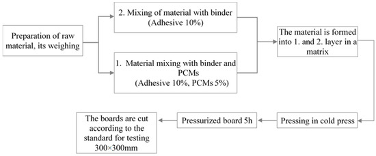 Board samples are manufactured using cold pressing (template and punch) 400 mm × 400 mm. These linear dimensions are selected considering the planned test methods and the necessary samples configurations for the tests. The prototypes of the material are made based on layers. Resin powder with hardener and water are dosed at the ratio of 2:1 according to the technical datasheet of the producer. Dosing cups are used to determine the binder amount. When the required homogenous mixture of the binder is obtained the Phase Change Material microcapsule, concentrated dispersion is added in the amount of 5% of the material dry weight. The stirring of the components is being done for 300 s to obtain a homogenous consistency. The binder is added gradually using a spray gun for shives to obtain a homogenous mixture, and at the same time, stirring is performed with an electric mixer over a period of 300 s. Hemp shives and binder mixture are formed by hand in the 400 × 400 mm template. This is done in two steps: during the first step, a part of the mixture is pressed to the thickness of 50 mm, and during the second step, the second part of the mixture is pressed, and the material is compressed to the required thickness of 25 mm. The template and punch form are immersed in a hydraulic press and pressed for 270 min at 20 ± 2 °C under 10 bar pressure taking into consideration the polymerization time of the Urea Formaldehyde Resin (Figure 2).