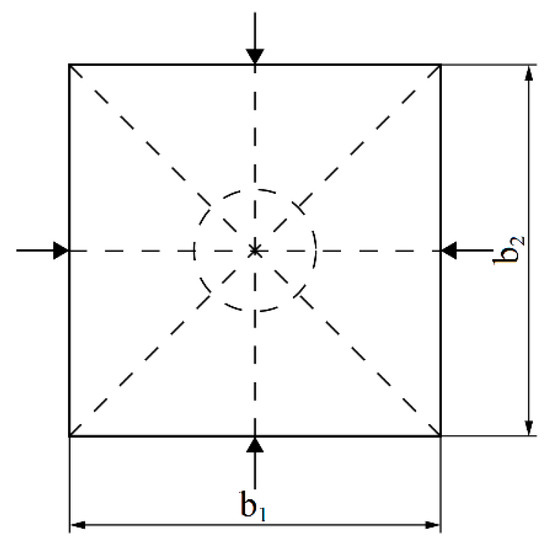 The density of board materials is determined according to the standard LVS EN 323:2000 [33]. According to the standard, samples 50 × 50 mm were cut from the pressed board and weighed on the scales “Kern” EMB 600-2. The external dimensions and thickness of the sample are measured with a digital caliper KS Tools 300.0532 (KS TOOLS Werkzeuge-Maschinen GmbH, Heusenstamm, Germany) with an accuracy of 0.01 mm. To determine the thickness of the samples more accurately, measurements are made in four places (Figure 3) and the average slab thickness is calculated. Based on the obtained measurement results, the board density can be calculated by the Equation (2) with accuracy up to 1% correlation: