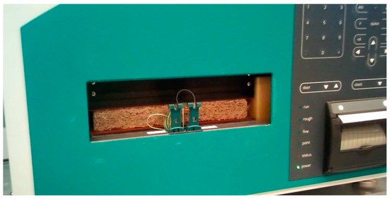 The most important property describing the efficiency of insulation materials is thermal conductivity λ (W/(m·K)). One of the most accurate and widely used approaches for the measurement of thermal transmission parameters in steady-state conditions is the use of the heat flow meter apparatus (HFMA) [34,35]. The Netzsch HFM 446 Lambda Small device (NETZSCH Holding, Selb, Deutschland) was used to determine thermal conductivity (Figure 4).