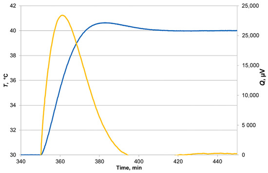 An example of determining the cp using a temperature ramp approach is shown in Figure 5. The yellow curve represents the heat flow meter output versus time for a heating step between 30 °C and 40 °C (blue line). Based on the integrated Q peak, specific heat capacity can be determined at a mean temperature of 35 °C for the chamber and inserted sample. The registered electric signal in subtracting the amount of absorbed energy for the heating of the empty chamber QE (which was obtained previously during calibration) gives the cp value for the analyzed sample: