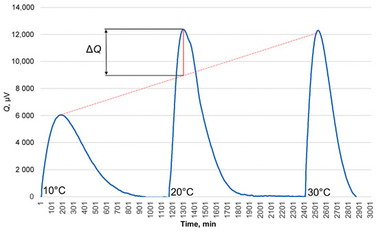 For the PCMs, when using them in combination with building materials, it is important that their melting temperature must be compatible with the room’s operating temperature, normally between 22 and 28 °C. In the experiments carried out, heating up was provided in three ranges: between 10 °C and 20 °C, between 20 °C and 30 °C (this range includes phase change), and between 30 °C and 40 °C. As it is seen from Figure 6, the energy amount needed for sample heating from 20 °C to 30 °C is higher than for linear interpolation, meaning that it includes also phase transitions heat. If the mass of added PCM as well as time and temperature difference is known, it is possible to calculate the latent heat using Equation (6).
