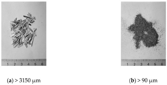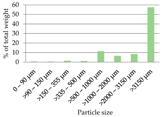 The seven sieves used for sieving enabled the determination of the particle mass distribution according to the dimensions of the sieve’s mesh (Figure 7). The largest proportion is the fraction exceeding 3150 μm—57 % of the total amount (Figure 8a). A significant proportion is measured also in sizes 500 μm to 1000 μm—12% of the total. The smallest amounts were determined for fractions with sizes less than 500 μm, and those less than 150 μm are just 3.5% of the total (Figure 8b). From the visual observation, it can be concluded that particles in a fraction above 3150 μm are uneven by their structure and size. There is a tendency for the particles to agglomerate when removing them from the sieve.