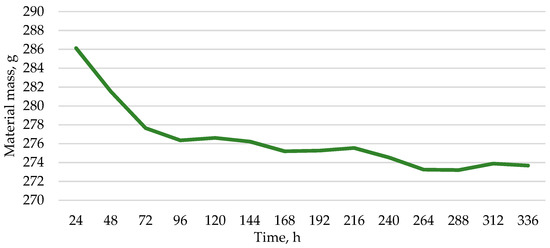 The initial mass of the sample is 286 g, but after 72 h the mass of the sample has decreased by 3% to 277 g. When recording the mass for up to 14 days, it can be observed that the change in mass fluctuates within 1.5%, which is normal for a material made of natural raw materials and that is based on moisture absorption and release. The obtained data are inserted in Equation (1), and the calculation results in the moisture content of the board of 4.5%. After 14 days, samples are placed in an oven at 105 ± 2 °C for 24 h. The initial sample weighs 286 g for the first sample and 273 g for the second sample. As a result of drying, the samples lose 8% and 10% of their weight, and the moisture content of the samples is 9% and 11%, respectively (Figure 9).