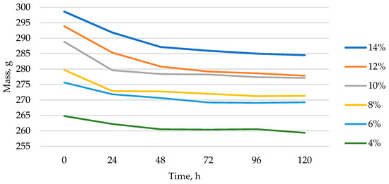 In parallel, by setting the optimal amount of binder, the amount of moisture in the board is determined depending on the amount of binder used. This experiment was performed to find out how quickly the mass becomes uniformly stable for further sample testing. Six groups of plates with different binder volumes ranging from 4% to 14% were made to analyze the moisture of the samples. After pressing the samples, the initial mass was found. To determine the change in mass of the respective samples, the samples were weighed after 120 h.