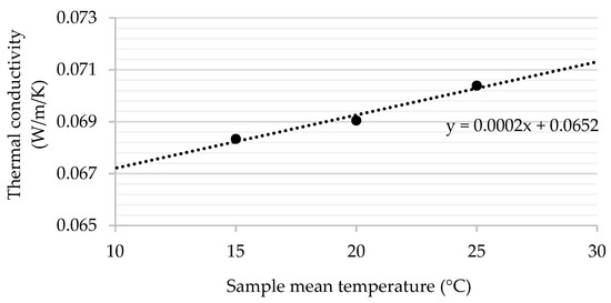 Thermal conductivity of the board samples changed within the range from 0.064 to 0.074 W/m K. In the sample with added PCM, the thermal conductivity is 7% lower than that of a hemp board without added PCM, which is 7% higher than that of a preserved hemp-shives mixture board (Figure 11). In the tests performed, it can be observed that if the density is 8% lower, then the coefficient of heat conduction is 7% better. To put it simpler, in this case, the increase in conductivity is determined by the decrease in the porosity of the insulating material. An example of temperature dependence is shown in Figure 12, where thermal conductivity of hemp shives samples with the integrated PCMs increase linearly with the temperature increase in a range from 15 to 25 °C. Thermal conductivity for similar unconventional natural raw materials like flax, reed, wood fiber, cement, wood, and wool ranges from 0.6 to 1.0 W/(m·K) [36,39,40,41,42], which is very close to the measured values.