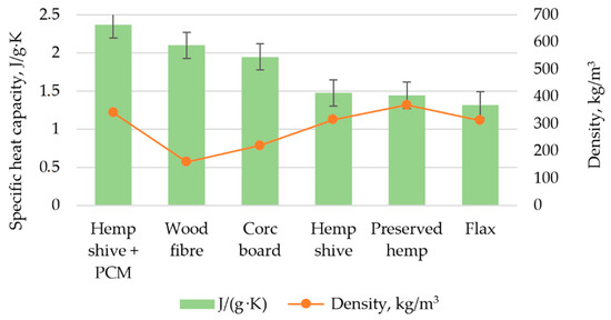 Another important performance indicator related to thermal properties of insulation materials is high specific heat capacity. This property can be beneficial in buffering indoor temperature—during the summer it can reduce the need for cooling. As seen in Figure 13, the specific heat capacity of the experimental materials is in a range from 1.444 to 2.369 J/g·K. According to the data analysis, it can be concluded that the thermal conductivity of the material samples is mainly influenced by the quantity of the components of the material. The highest value of material-specific heat is for hemp shive with integrated encapsulated phase change material, and this value is 63% higher than material without phase change material. Values of specific heat capacity for similar unconventional natural raw materials like flax, wood fiber, cement, wood, and wool range from 1.280 to 2.100 J/g·K [40,41], whichis very close to the measured values. The hemp shive sample has a 12% higher specific heat capacity than commercial material with a higher value.