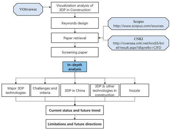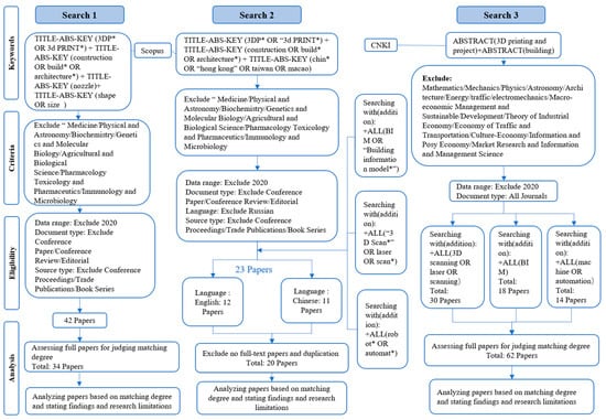To evaluate 3DP practices, two primary databases were selected to conduct interpretivist research, namely Scopus and China National Knowledge Infrastructure (CNKI). Scopus is a high-quality international database and CNKI is an extensive database that includes Chinese scholarly papers. Different keywords, such as building information modeling (BIM) [28], scanner [15,29], and 3DP, were used to identify relevant papers within the construction and structural design fields. Figure 1 illustrates the outline systematic review process, keywords and the exclusion or inclusion criteria, whilst Figure 2 presents the methodology used for collecting, selecting and filtering relevant articles based on the preferred reporting items for systematic reviews and meta-analyses (PRISMA) approach [30], and similar systematic reviews in the construction field [31,32]. The bibliographic analysis was used since it shows who contributed to the topic and how the topic has evolved over time [33,34]. A set of keywords was used in combination with 3DP to review how these technologies work together and identify the existence of potential applications. Analytical network maps of co-occurrences of keywords were generated in order to visualize the main concepts in the 3DP literature and their possible evolutions or inter-relationships. This is a common and useful practice that is used for other topics in construction [35,36].