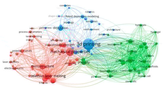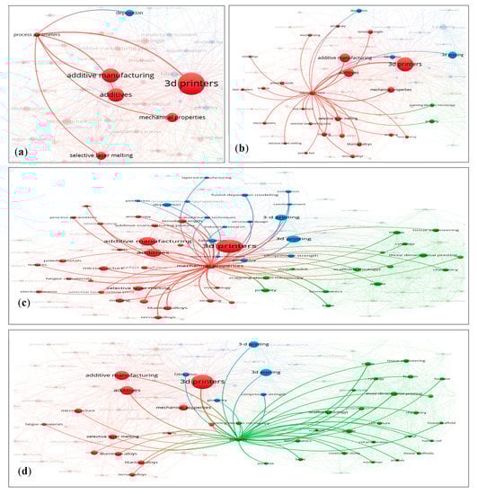 Co-occurrence analytical map of selected keywords created on bibliographic Scopus data for each group of keywords within and outside their individual groups: (a) process parameter network map; (b) microstructure network map; (c) mechanical properties network map; (d) porosity network map. Note: the minimum number of co-occurrences of keywords was 40, with a minimum strength of 0.