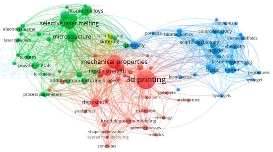In order to identify the current status of 3DP in construction, in terms of co-occurrence of keywords, a networking approach was used, which incorporated recent papers from the three-year period 2018 to 2020. Figure 3 shows the network of keywords limited to journal articles within six relevant subjects: engineering, computer science, business, decision sciences, social sciences, and energy. The string was considered based on the Search 2 strategy (refer to Figure 1): Title-Abs-Key (“3DP” OR ”3d PRINT *”) AND Title-Abs-Key (”construction” OR “build *” OR “architecture *"). VOS viewer was used to identify keyword hot topics of 3DP research in the construction context based on the co-occurrence of keywords. Figure 4 shows fractional analysis of the co-occurrence network, which mainly relates to “mechanical properties”, “microstructure” and “material science”. Figure 3 and Figure 4 show the key focuses in this area, including the links of 3DP concept with “tensile strength”, “compressive strength” and “mechanical properties”; the mechanical properties of the material are the bases of 3DP implementation in construction. Thus, researchers have conducted research of 3DP in construction from the microscopic and macroscopic perspectives, respectively. The keywords “shape optimization” and “process parameters” were also connected to “3d printing” [37,38,39,40,41]. This connection shows that the optimization of printing parameters and specimen shapes are still the key focus of future research [42,43,44,45,46,47,48,49]. Figure 3 shows the appearance of the ”robotics” key word [50,51,52,53] and Figure 5 shows the co-occurrence of key words. This means that the construction phase will be handled by robots rather than humans.