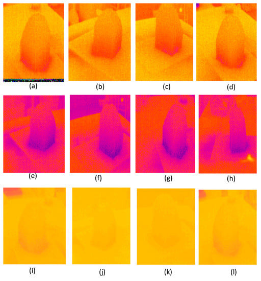 Model thermal and humidity analyses in the laboratory: (a–d) model thermal image 24–28 degrees; (e–h) model thermal image 25–29 degrees; (i–l) model humidity, 65–66% rh with 28 degrees using a thermal scanner 875-2i (source: authors).