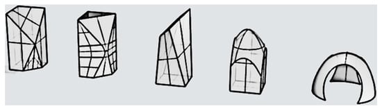 Five different designs of architectural models, including angles and curves for evaluating the performance of any proposed 3DP.