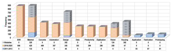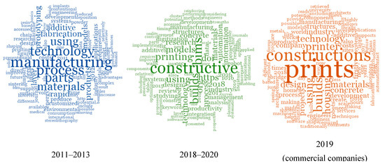 Figure 11 shows the frequency of keywords within a different set of documents collected from scholarly papers and the website content provided by different relevant companies. Interestingly, the content analysis of 50 websites of commercial companies shows that robots and housing applications are of the most concern in practice. Zhang and Su [65] report that standard concrete cannot be adopted, the processing of the additive materials and the size of the 3D printer are limitations, the size of material aggregates is significant and the admixture mechanism properties may change when added into the 3DP “ink”. Therefore, the transformation between the software and reality is vital. The major limitation mentioned is that the windows, doors and pipework cannot be printed at the same time. Figure 12 presents a set of the most frequent words within the datasets and gives an overall idea about the main concerns within the literature or within the industry. The figure shows the shift from technology, manufacturing practice and process definitions at the beginning of the decade to the integration of 3DP with BIM, automation and productivity at the end of the selected decade from 2018 to 2020. The figure also shows that conversation in commercial companies is revolving around housing applications as a high demand market and the introduction of using concrete by 3DP.