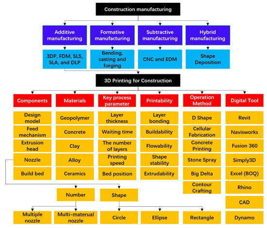 Tao et al. [59] discuss 3DP as a high-level accuracy manufacturing process that can be controlled to within 0.3 mm. For instance, the project SD 6000/7000 of 3D Systems can reach 0.025 to 0.05 mm, suitable for major products’ requirements. 3DP is highly efficient as no mold is required during the process, but customized products can be created using a diverse range of materials. Therefore, 3DP can control the financial budget while maximizing customer satisfaction and is an eco-friendly construction method.
