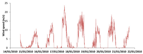 Depicts the wind speed recorded at the top of the building for one week (4 m from the ground level).