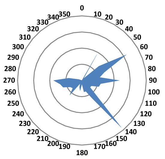 The direction and speed of the wind tends to change with time. Figure 6 and Figure 7 show the speed and direction of the wind recorded at intervals of 5 min at the location for a duration of a week between 14 January 2020 and 21 January 2020.