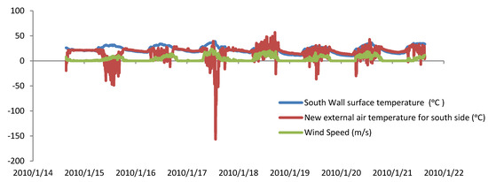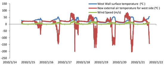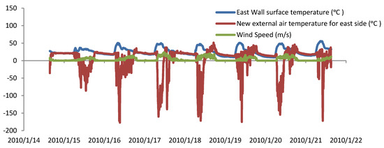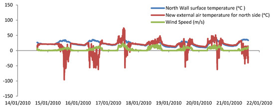 Higher wind speeds increase the wind effect, which results in an increase in the new external air temperature particularly with the wind effect on the windward wall. Since most wind came from the East and West directions (see Figure 3), the effect on the eastern and western wall was much higher compared to that on the northern and southern walls as depicted in Figure 11 and Figure 12.