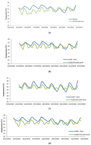 Building internal air temperature for CFD simulation with wind effect and real data (a) cavity brick (CB) module, (b) InsCB module, (c) insulated brick veneer (InsBV) module, (d) insulated reverse brick veneer (InsRBV) module.