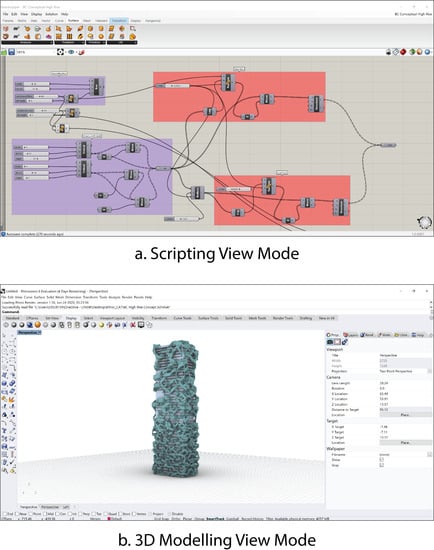A small number of past studies have examined micro-cognitive processes in parametric design. Yu et al. [], for example, capture “unexpected discoveries” in parametric design using Gero’s Function-Behaviour-Structure (FBS) coding scheme [,], which promotes continuous exploration in the design “solution space”. They also observe that designers often switch between the scripting interface and the geometry modelling interface to examine a model after changing parameters or rules (see Figure 1). The scripting interface enables the composition of visual (e.g., Grasshopper) or textual scripts (e.g., Python and Maya script editor) consisting of algorithmic components that define external geometries. The geometry modelling interface then represents the resultant forms or shapes, usually in the “3D modelling view” mode. These characteristics are also identified in a series of Lee et al.’s protocol studies [,,,]. The most recent, combining consensual assessment techniques (CAT) with protocol analysis, identifies four parametric design activities (changing parameters, perceiving geometries, introducing algorithmic ideas, and evaluating geometries) that can support creative problem-solving []. Results further suggest that “making generation” is critical for creative outcomes, because it reflects two well-known creative design strategies in parametric design, “problem-forwarding generative strategy” and “solution-reflecting generative strategy” [].