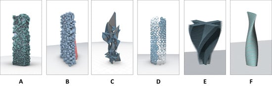- Lee, J.H.; Gu, N.; Williams, A. Parametric design strategies for the generation of creative designs. Int. J. Archit. Comput. 2014, 12, 263–282. [Google Scholar] [CrossRef]