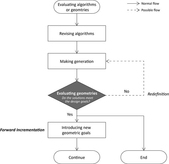 The conclusive DMP may be a core part of the classic working forward problem-solving techniques, “hill climbing” and “divide-and-conquer”, setting up detailed and directed goals before developing solutions. It typically includes the setting of sub-goals and segmentation or decomposition of problems, and then solves sub-goals through a staged, iterative “step-by-step” process, before initiating a solution. In this context, the conclusive DMP is clearly part of the problem-forwarding generative strategy that supports creativity in parametric design []. Moreover, it also leads to “forward incrementation”, which is a creative DMP operation (Table 1) in parametric design. If the solution is not satisfied, the conclusive DMP may be able to undertake a cyclic redefinition process, G–EG–G, but this additional process is more closely related to the other two creative DMPs.