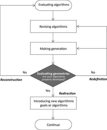 The micro-pattern G–EG–EA is also frequently followed by EA–RVA–G, which is also the most common before the confirmative. That is a cyclic pattern (e.g., EA–RVA–G–EG–EA) of evaluating algorithms, revising algorithms, making generation, evaluating geometries, and then again evaluating algorithms. This process is akin to the reconstruction operation, returning the “field” to its original position, and then moving it in a new direction. In contrast, G–EG–RVA and G–EG–G develop the short cyclic patterns in Figure 5, suggesting a rapid change or redefinition. These creative operations might be related to Nikander and Liikkanen’s argument that concept rejection can lead to revision or new generation phases []. Collectively, the confirmative DMP involves three creative operations, redirection, reconstruction, and redefinition, based on solution-reflecting activities.