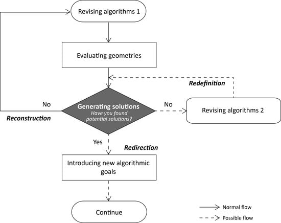 The conclusive and simulative DMPs identified in this paper can also be used to conceptualise decision-making patterns that involve additional analytic tools or plug-ins. However, parametric design processes are frequently combined with various design analysis and simulation stages that support decision-making in practice [,,]. Moreover, designers in parametric environments sometimes, use traditional design tools like pen-and-pencil, to explore visual representations at the conceptual design stage. These switching behaviours could lead to important creative DMPs, which the present paper will not capture, because the experiment required designers to work with an algorithm editor and 3D modelling tool. Nonetheless, the coding scheme exploring creative DMPs in this study is useful for capturing both algorithmic and geometric modes and their repetitive processes in parametric design environments. Chusllp and Jin’s three iterations (problem redefinition, idea stimulation, and concept reuse loops) in the traditional design environment [] also help to conceptualise these DMPs in mixed design environments. In particular, the “problem redefinition loop” enables us to research decision-making activities in the problem space as well as “co-evolution” (e.g., “problem leads to solution” and “solution refocusses the problem” []).