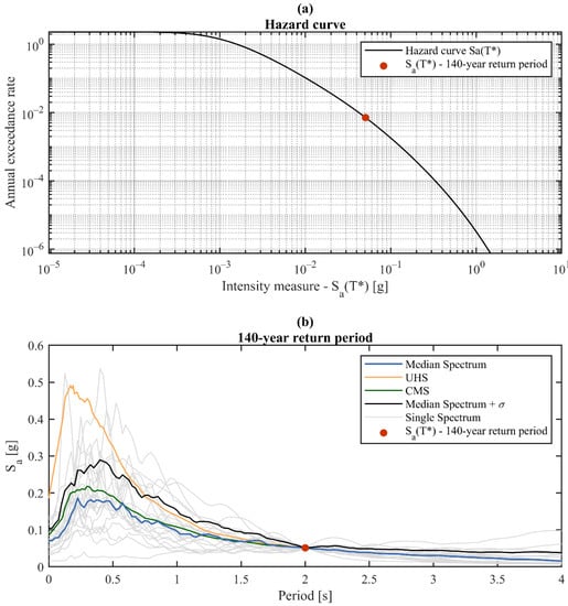 Figure 3 illustrates the hazard curve and conditional mean spectrum, for an illustrative return period (140 years), adopted for the selection and matching of ground motion records. The conditional mean spectrum was developed, according to the methodologies proposed by Baker [32] and Jayaram et al. [33], at different RPs. Both seismic hazard calculations and development of conditional mean spectra were performed using the free software REASSESS [34]; in the hazard calculations, the ground motion prediction equation proposed by Ambraseys et al. [35] was adopted. Regarding the spectral acceleration correlation, the methodology outlined in Baker and Jayaram [36] was employed.