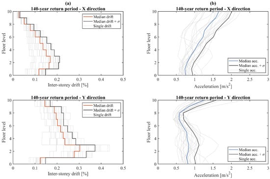 Acceleration and displacement time histories obtained for each storey of the building were first processed to derive the peak acceleration profiles and the peak interstorey drift profiles in both longitudinal and transverse directions, allowing structural response/performance to be quantified for the two seismic intensities of interest. Figure 4 shows key structural response parameters in X and Y directions for RP = 140 years, whereas Figure 5 presents the counterparts corresponding to RP = 200 years. The comparison is therefore two-fold, involving (i) the two building directions for the same intensity, and (ii) the intensities related to the two serviceability limit states, namely OLS and DLS, for the same building direction. For the sake of completeness, both Figure 4 and Figure 5 depict drift and acceleration profiles resulting from each individual record, along with the median and the median plus one standard deviation such that a measure of the record-to-record variability could be provided.