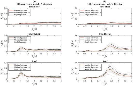 Individual and statistical displacement floor spectra for RP = 140 years—First floor, mid-height and roof: (a) longitudinal, X direction; (b) transverse, Y direction.