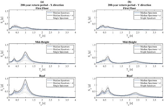 Acceleration floor spectra for RP = 200 years—First floor, mid-height and roof: (a) longitudinal, X direction; (b) transverse, Y direction.