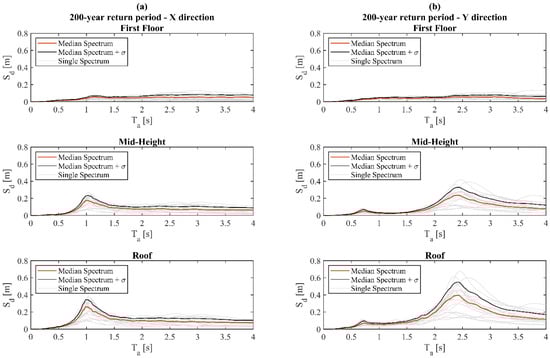 Displacement floor spectra for RP = 200 years—First floor, mid-height and roof: (a) longitudinal, X direction; (b) transverse, Y direction.