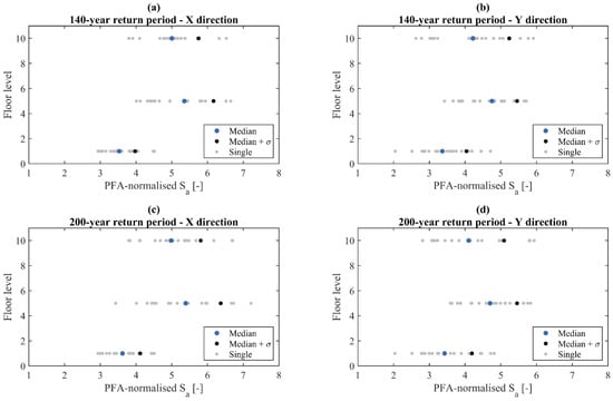 PFA-normalized maximum spectral accelerations over the structure height: (a) RP = 140 years, X direction; (b) RP = 140 years, Y direction; (c) RP = 200 years, X direction; (d) RP = 200 years, Y direction.