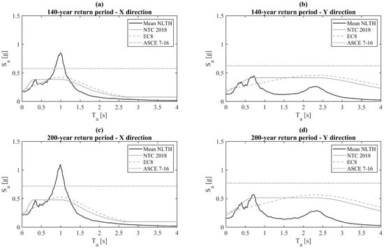Comparison between absolute acceleration top floor response spectra obtained from nonlinear time–history analyses and code formulations: (a) RP = 140 years, X direction; (b) RP = 140 years, Y direction; (c) RP = 200 years, X direction; (d) RP = 200 years, Y direction.