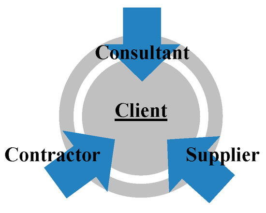 There are universal motives for outsourcing, including globalization, increasing complexity and emerging markets [23]. The construction industry constitutes a considerable portion of the national economy all over the world [24], and outsourcing plays a significant role in it. The construction industry involves hundreds of companies in a wide range of services, and their evaluation process should cover competitive capabilities and managerial aspects [16]. The source selection problem can be analyzed through the project contract strategy viewpoint. For instance, [25] has proposed the partnership as the most appropriate delivery method for lean construction. However, in the case of selection, the outsourcing method for the project as the output of the make-or-buy analysis, the source selection problem will arise. It should be noted that within the wide range of stakeholders of a project, the key sources with which the client of the construction project usually concludes a contract are the construction consultant, the construction contractor and the construction supplier [26,27,28,29,30,31]. In the buying process of construction projects, these parties, which act as the source and are known as the seller, can be defined as follows (Figure 1):
