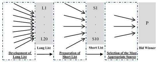 Ref [16] considers three major levels for acquiring a supplier source: main selection criteria, subset selection criteria and determination of each order quantity. Other research studies argue that contractor selection consists of three phases, which include research to create a long list without prejudice (no more than 12), prequalification to create a short list and tenders for carrying out the assignment [44]. Ref [45] states that the adequate number of shortlisted contractors in design–build projects is approximately 3 to 5 sources. Although some researches implicitly differentiate between qualification stages and final selection of the contractor, these steps are not clearly distinct [46]. However, there are some studies that define the procedure of source selection in the procurement effort. Ref [23] explains the contractor section process in Taiwan, which consists of basic qualification to a long list (more than four bidders), preliminary short-listing and final selection. Ref [47] proposes five stages—packaging, invitation, prequalification, short-listing, and bid evaluation—for contractor selection. In addition, [48], has stated that there are four steps to select the contractor in a design–build contract as follows: