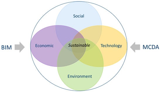 As it was mentioned above, sustainability by its broad umbrella carries environmental, economic and social categories for ensuring the needs and requirements of a project and users. Variety of technologies distinguish construction processes and requires analyzing the technological aspects as separate and important sustainability category. The sustainability categories used in this research were selected based on the traditional approach and alternative insights, and include environmental, economic, technological and social categories (Figure 1). A sustainability assessment of alternative solutions implies the use of many criteria; therefore, the model proposes the application of multi-criteria decision adding (MCDA) methods as reliable and versatile tools for decision-making [42]. Additionally, dealing with many alternatives the decision-maker gathers a big amount of data. The existence of human factors leads to distorted incomplete data and finally to the question of the reliability of gathered data sets. The risk of unreliable data and information could be reduced if automated data gathering and processing are used. The application of Building Information Modeling (BIM) tools provide the solutions, thereat, the model proposes the inclusion of BIM tools for gathering reliable data (e.g., quantities) necessary for sustainability assessment (Figure 1).