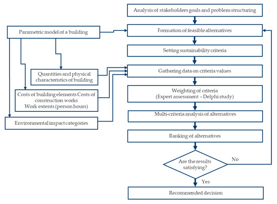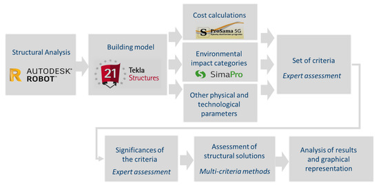 The present study adopts a methodology consisting of an analysis of literature, an expert assessment, and a case study analysis. The sustainability categories selected based on the analysis of the existing studies in the field of sustainable structural design. By using a 3-step Delphi study approach, experts set up the feasible alternatives, selected the criteria system, and determined the weights of criteria. Furthermore, in the case study, the criteria values were calculated and a multi-criteria assessment of the alternatives was performed. The next sections describe in detail the steps followed in the work methodology.