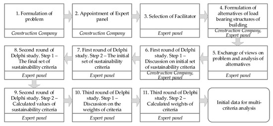 This Delphi study was conducted in three rounds (Figure 3). First, the group of experts chose the facilitator—a neutral university expert who had experience in Delphi technique applications. During the Delphi study, experts exchanged viewpoints and each independently gave estimates to the facilitator. The experts had a task to decide on a set of criteria that should be relevant and universal for application in other cases. Ten experts of experienced and knowledgeable people from construction companies and academic institutions were selected for the panel (Table 2). Experts were required to have knowledge and experience in the field of civil engineering, participated in international projects, and performed consultancies in the construction sector. During the evaluation process, the main criteria for selection were that candidates had to have a masters’ degree or higher and five or more years of experience in the field of civil engineering.