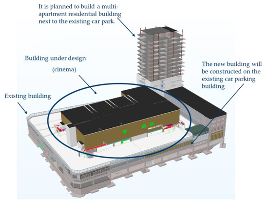 The object of this study is the commercial building adapted to the cultural purpose (cinema). The designed building has eight cinema halls. The building structures will be mounted on the existing multistorey parking garage (Figure 4). The distances between the axles of the new building are 16.28 m. The height of the existing building is 9.5 m and the height of the new building is 15.5 m. The total height of the building is 25 m.
