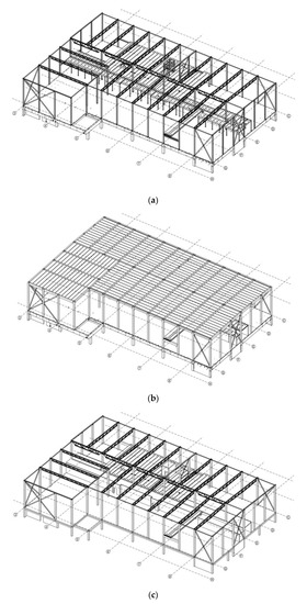 Figure 5. Alternative structural solutions of the building under investigation: (a)—alternative A1; (b)—alternative A2; (c)—alternative A3. - Alternative A2. Prefabricated reinforced concrete bearing elements (Figure 5b).
