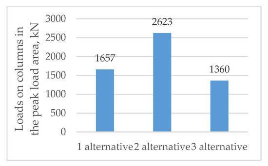 The third alternative of the load-bearing structure is the monolithic reinforced concrete frame (Figure 5c). The struts, turrets, wooden beams, plywood and other elements needed for concreting the slabs are brought to the construction site by crane. The workers install the slab formwork by hand. The workers at the construction site also bind the reinforcement frames. Concrete from the concrete mixer is pumped to the formwork. The formwork used to form walls and columns is mounted using the crane. To create large spaces in the building, the roofing is mounted on trusses. In this way, a span of more than sixteen meters is covered.